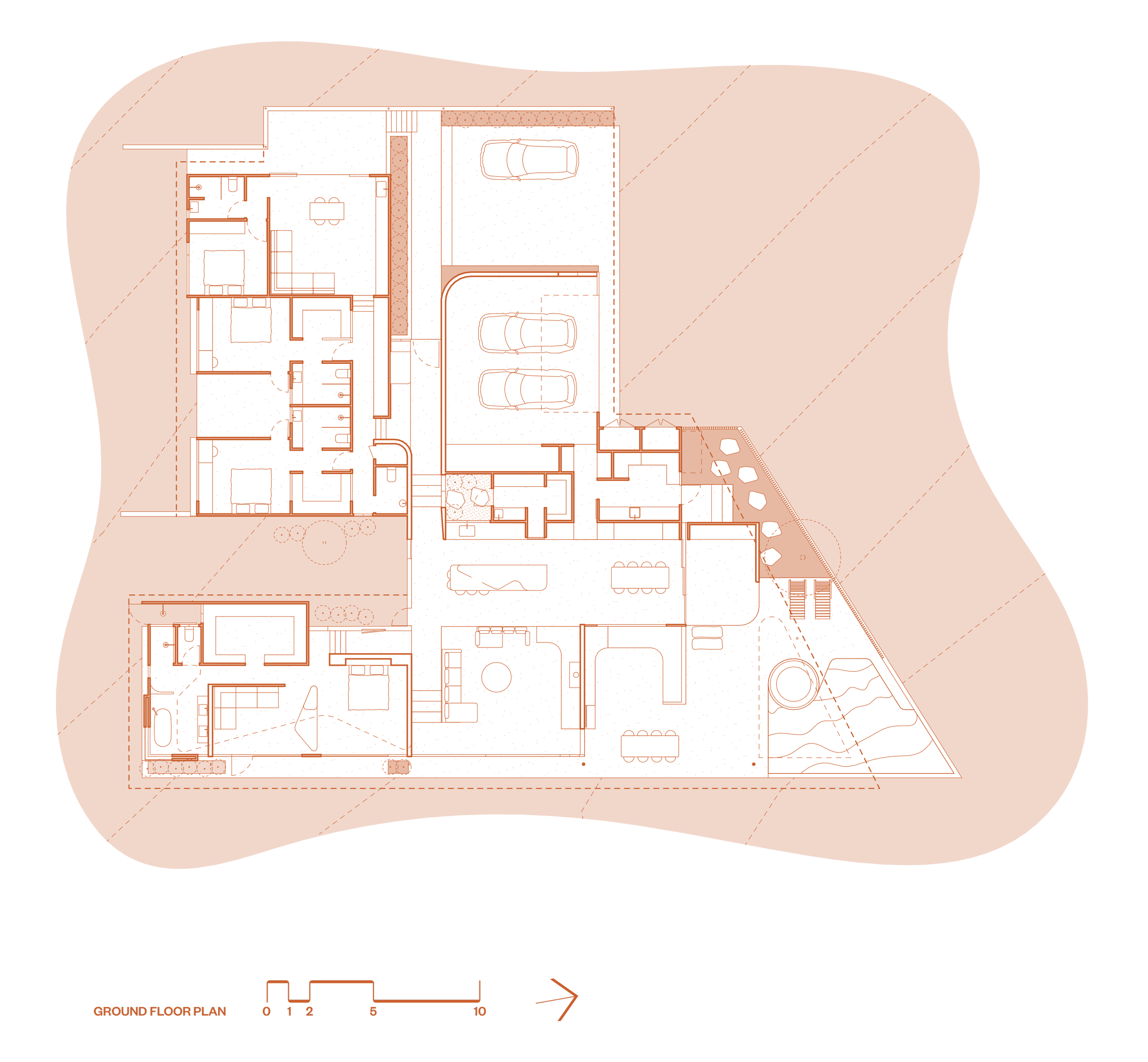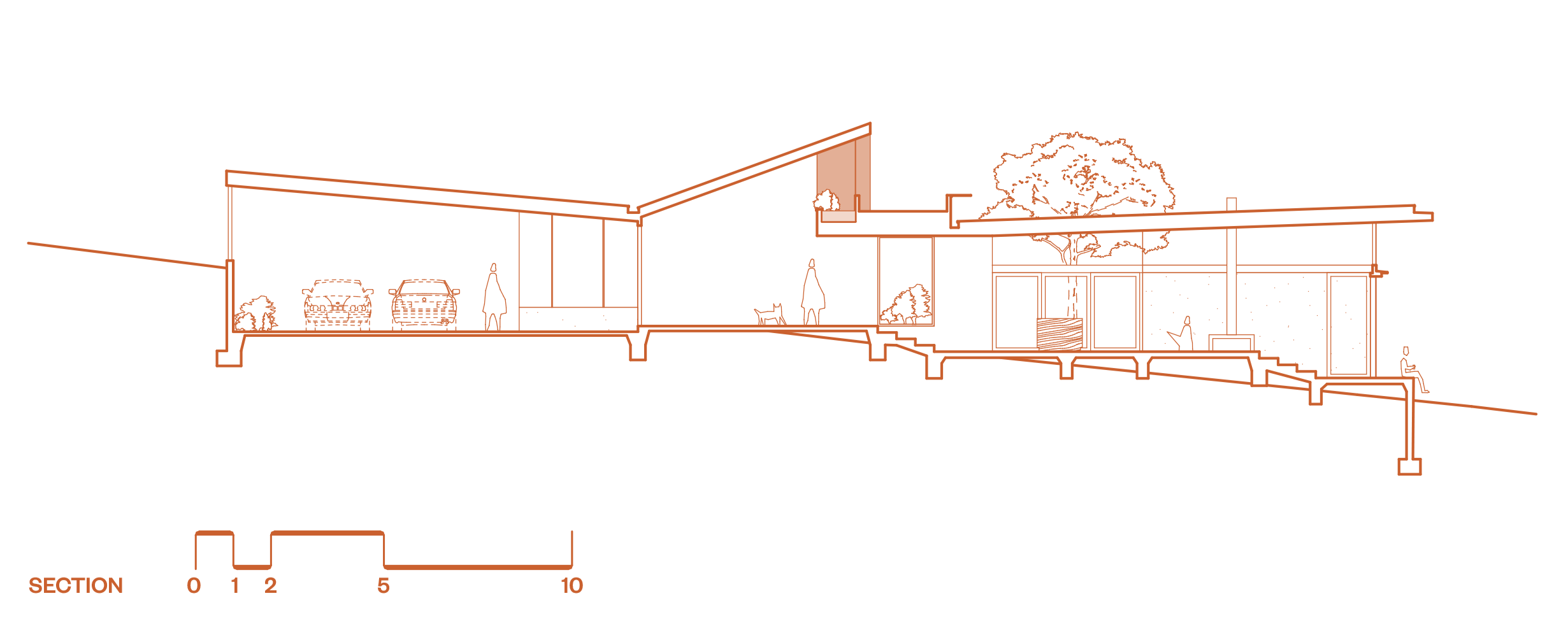 The bushrock base of the house seems to emerge from the earth and combines with the roofline to read as a pair of parallel lines set against the hillside. An almost transparent skin allows complete immersion with the private natural context, with regulated privacy where required. Materials chosen are warm, tactile, of their place, and make every effort to connect our clients to their precious coastal setting.