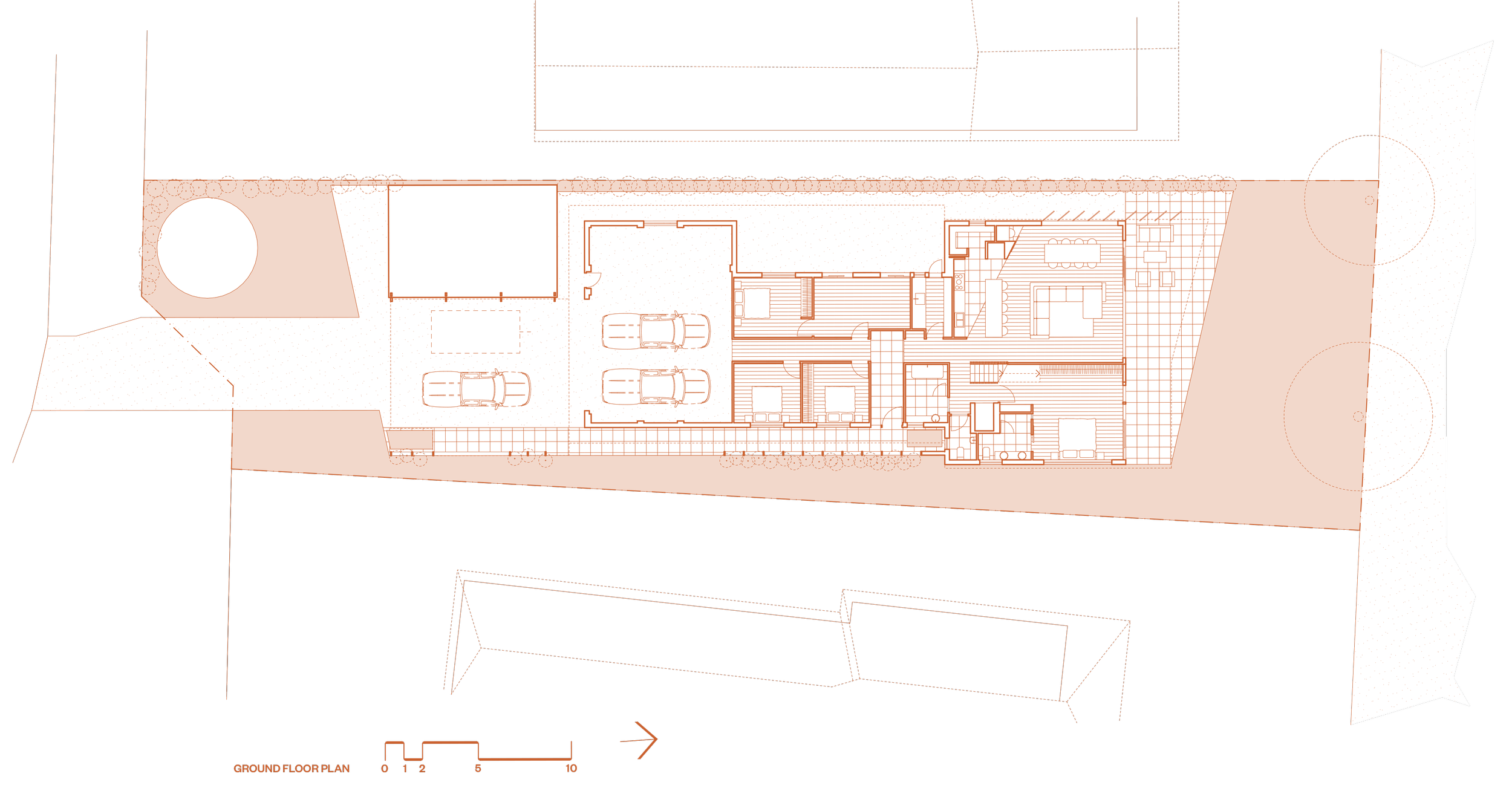 We then created a new formal entry which is accessed through a trellised screen on the south side of the house. This creates a more rational path to the public areas of the house while the form of the screen acts to graft the new works onto the existing building.