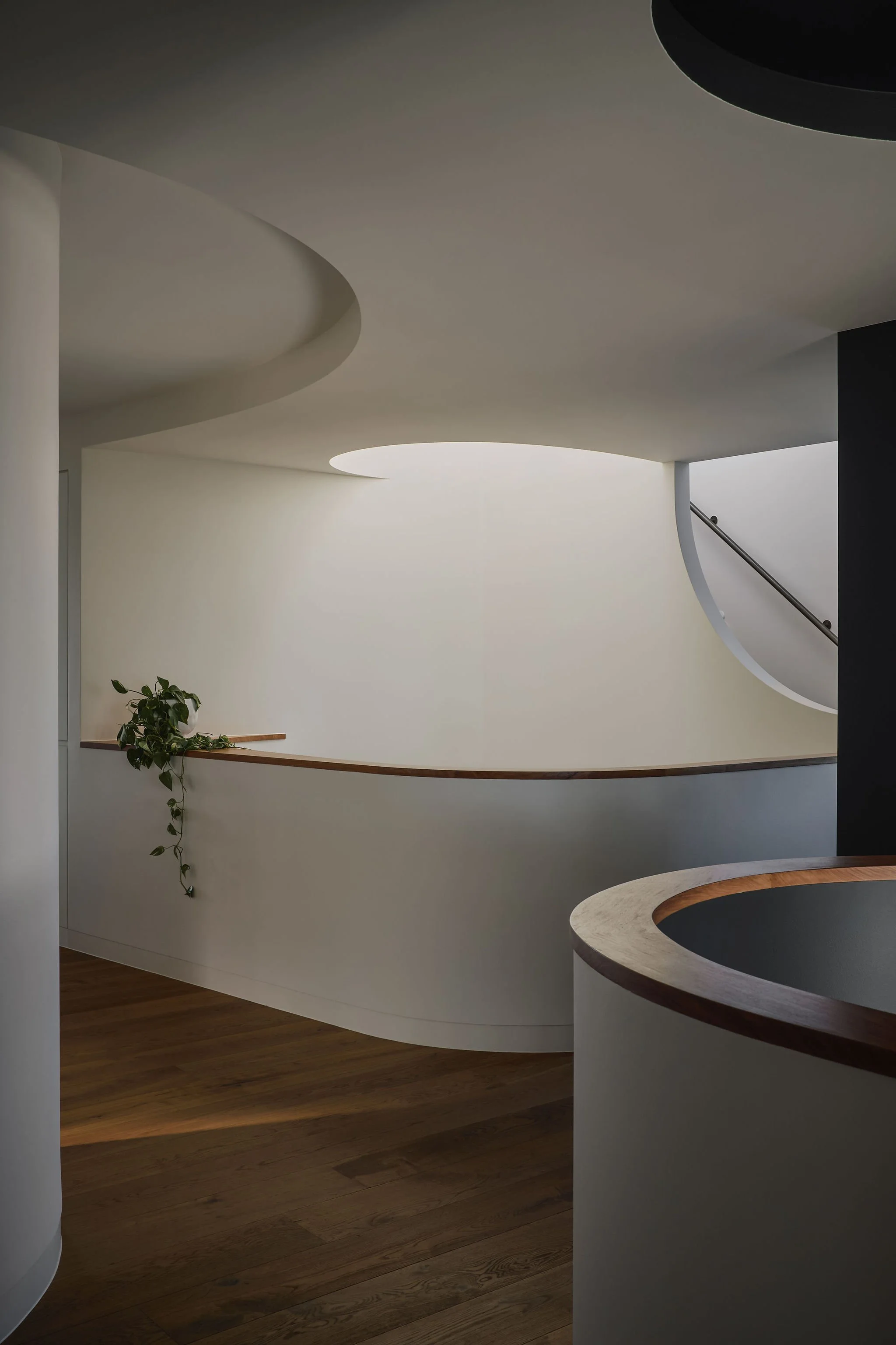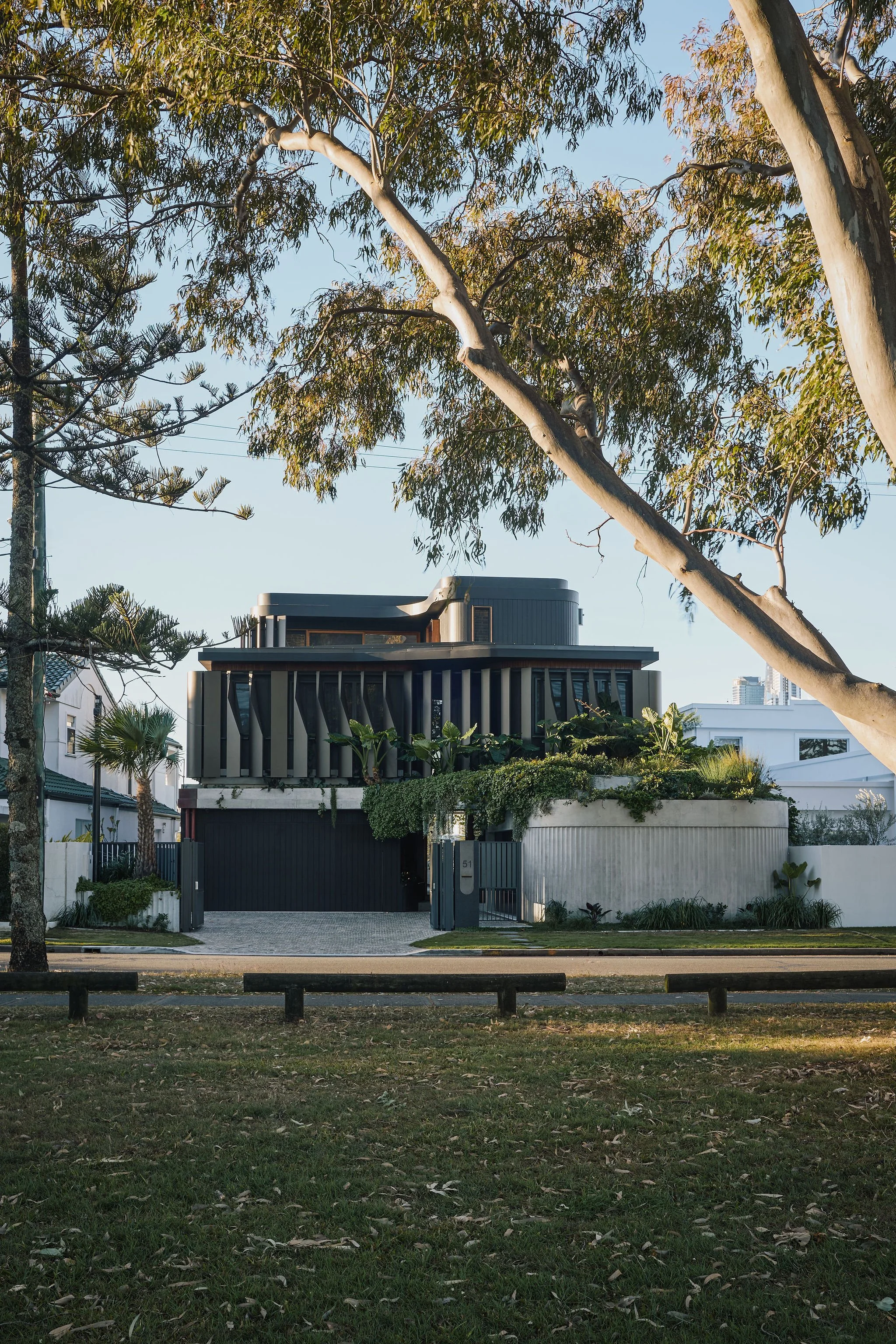 Privacy is maintained from the street through layers of screening and landscape that surround the cobbled forecourt. A scalloped and curved concrete form pushes out towards the street engaging with the neighbourhood with planting spilling down the textured wall.