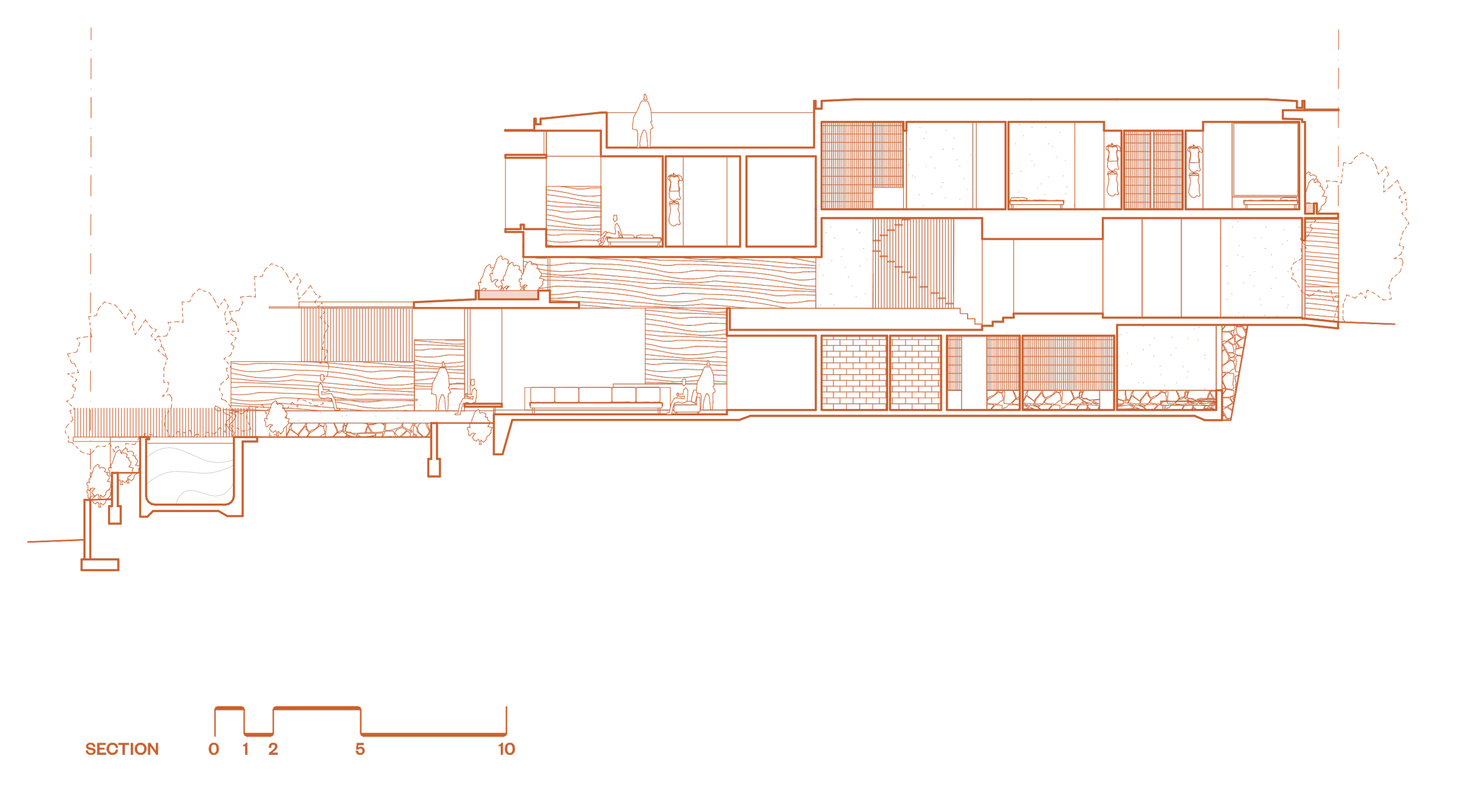 The house is proposed as a series of spaces that cascade gently down following the site contours alongside a singular organising element – a sculptural rammed earth wall.