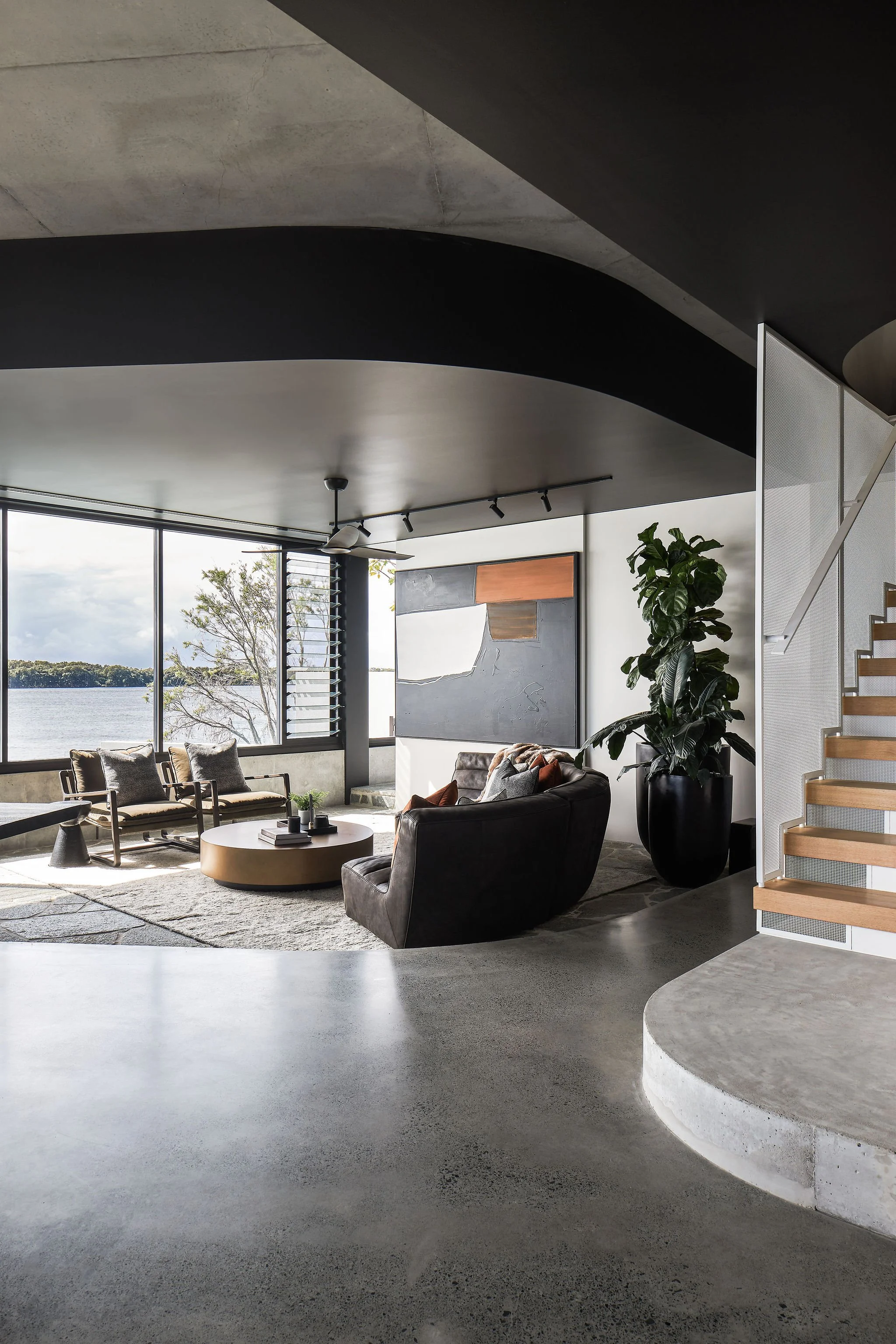 Living areas are housed in a ground floor shell of rich, dark and tactile materials. Water views are revealed slowly and intentionally.