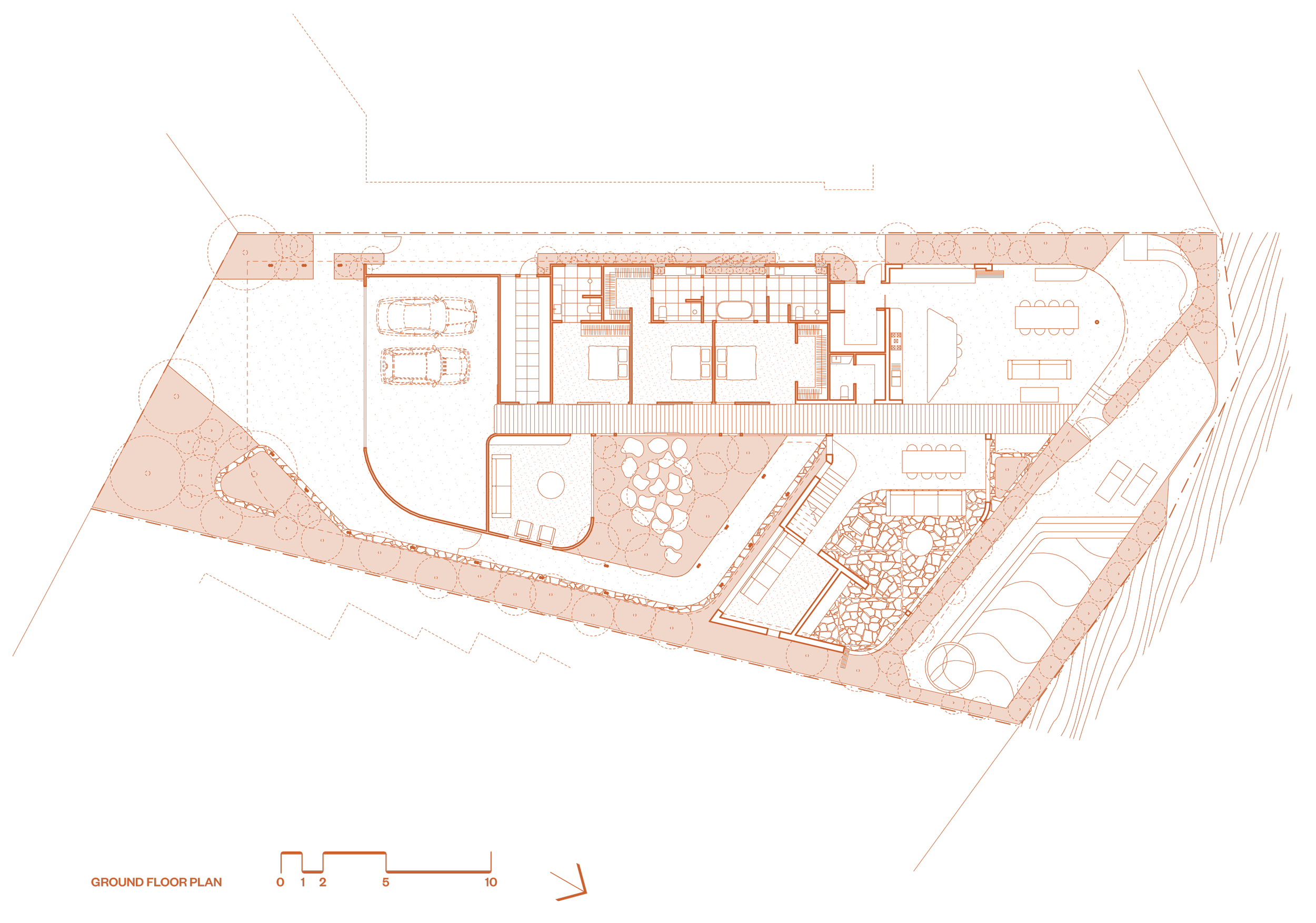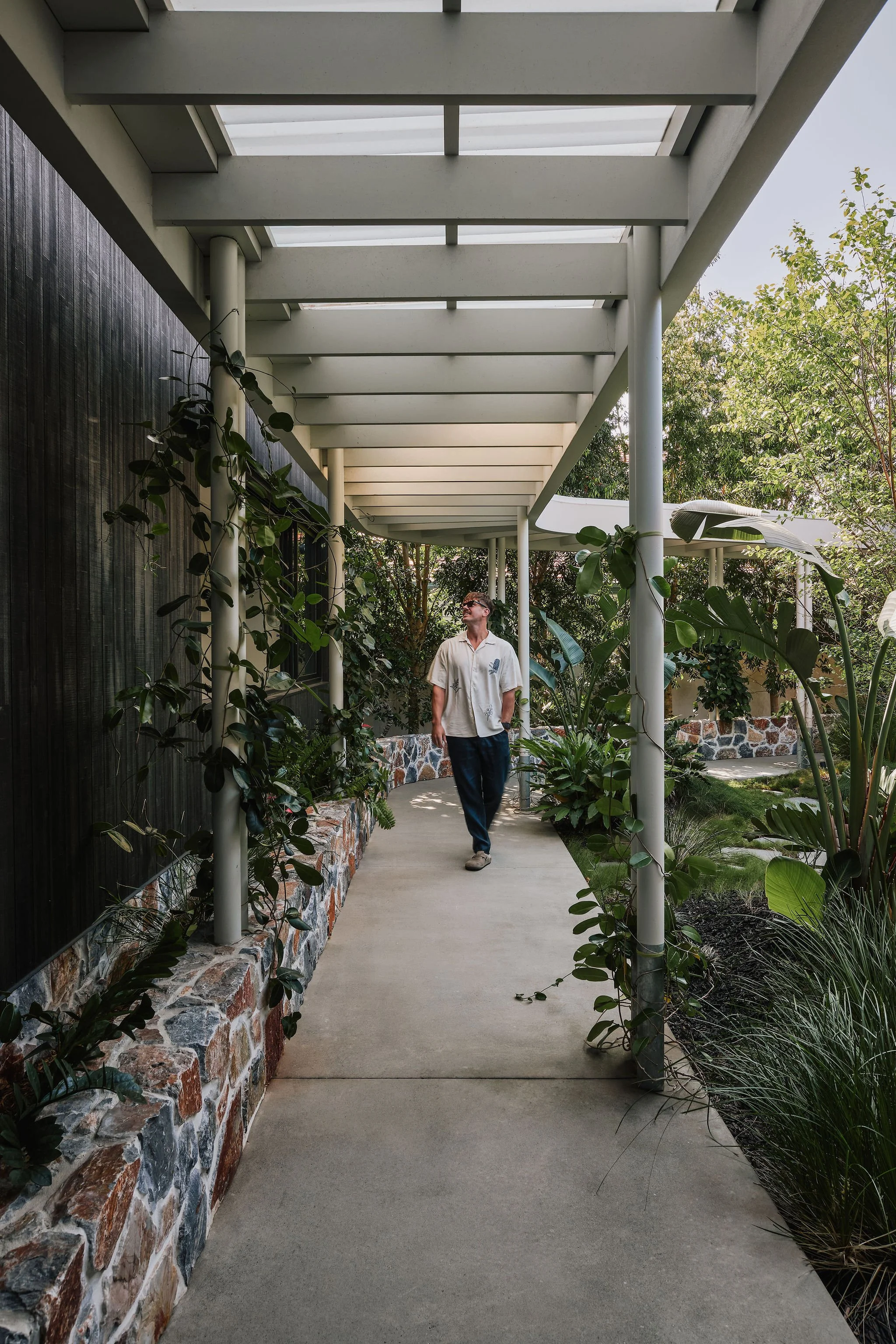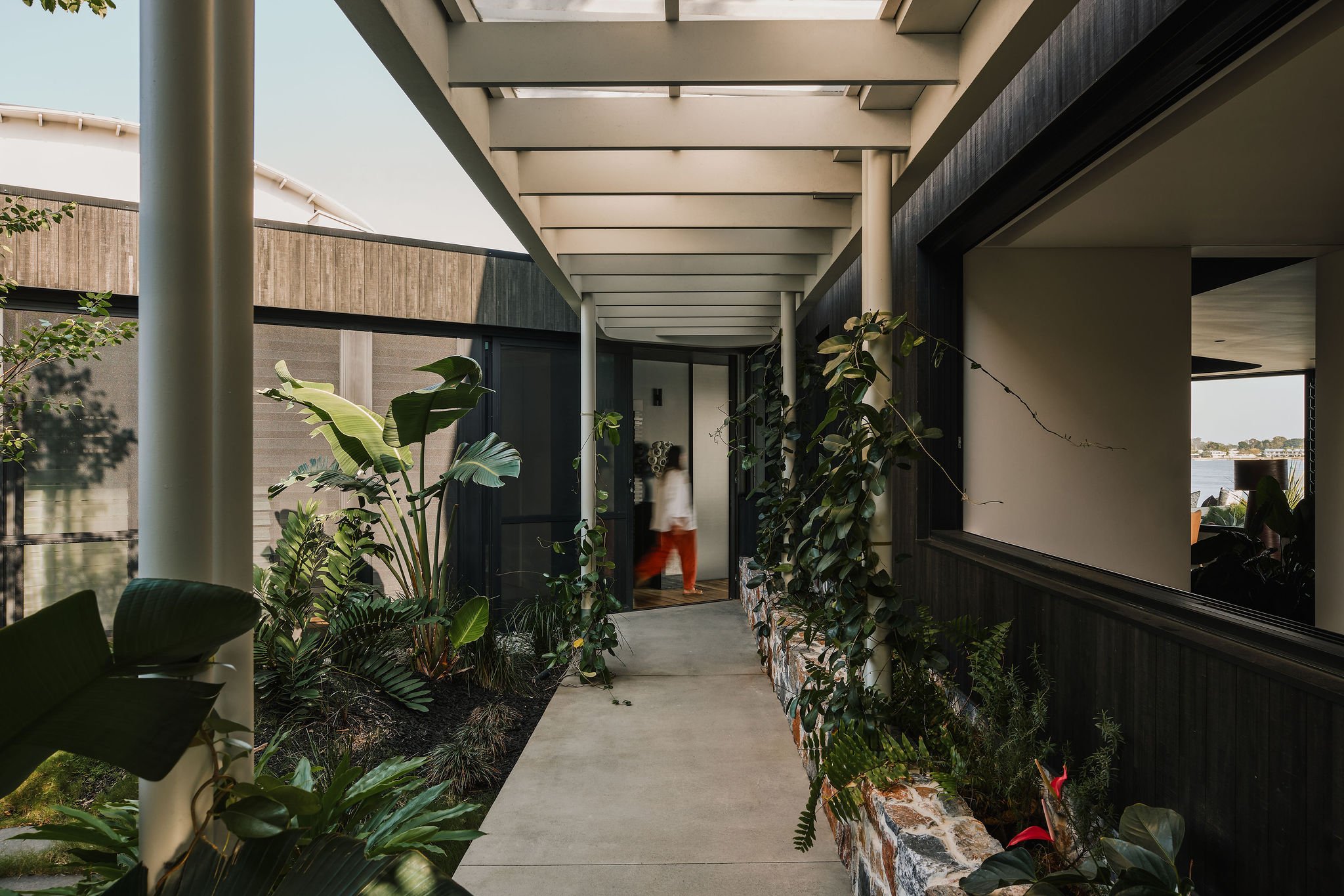 Visitors to the house enter along the protected edge of a landscaped courtyard. This is the green heart of the house with all adjacent rooms orientating back to connect to this space.
