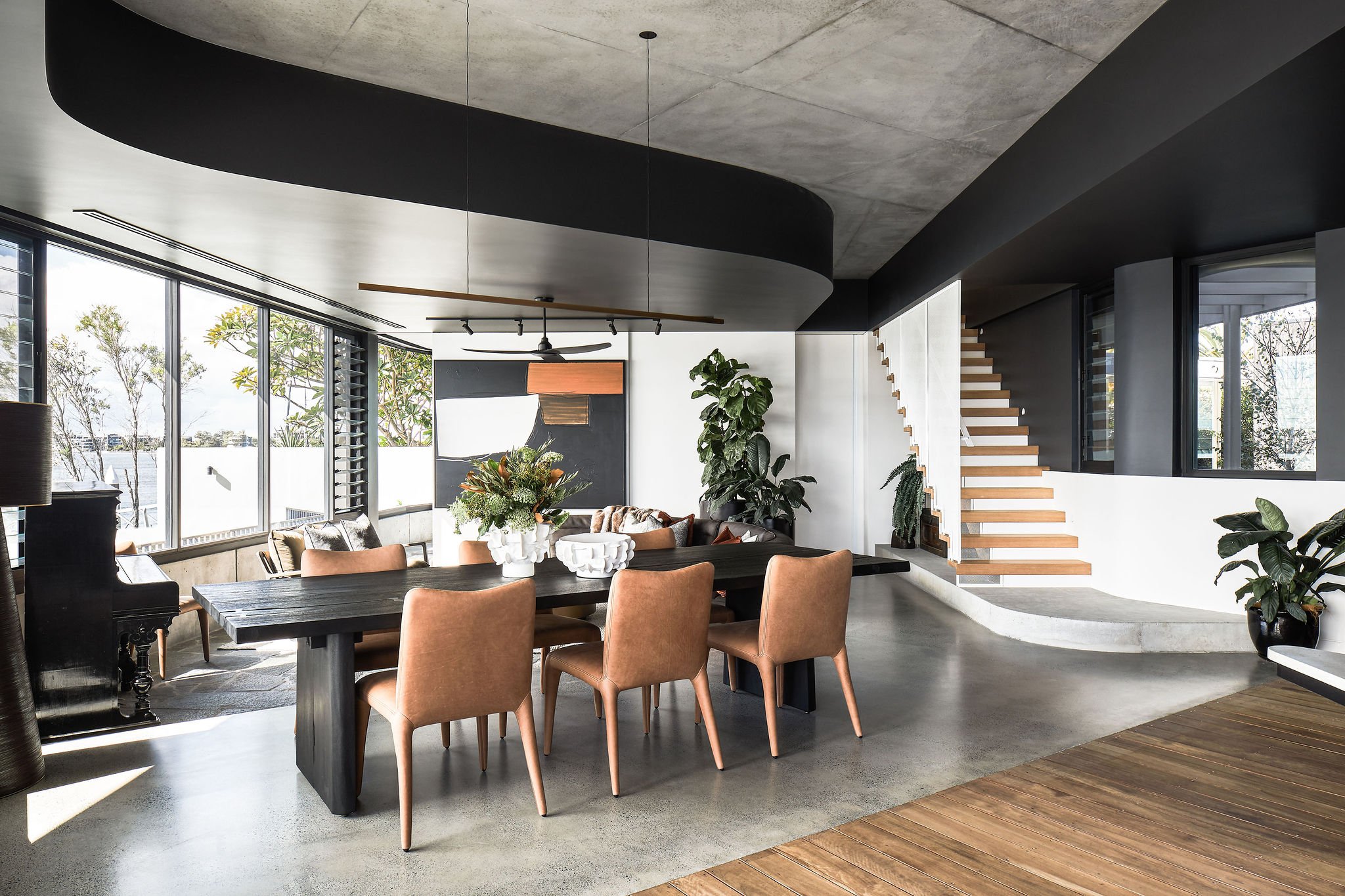Internally, the private entry to the house from the garage is timber lined and seems to stretch out into the water beyond like a jetty. It draws you out past private bedrooms, and on towards the living spaces on the northern edge that sits right on the water. Warm northern sun streams into these rooms, warming the stone floor and allowing the owners to sit peacefully watching the marine traffic and birds go past.