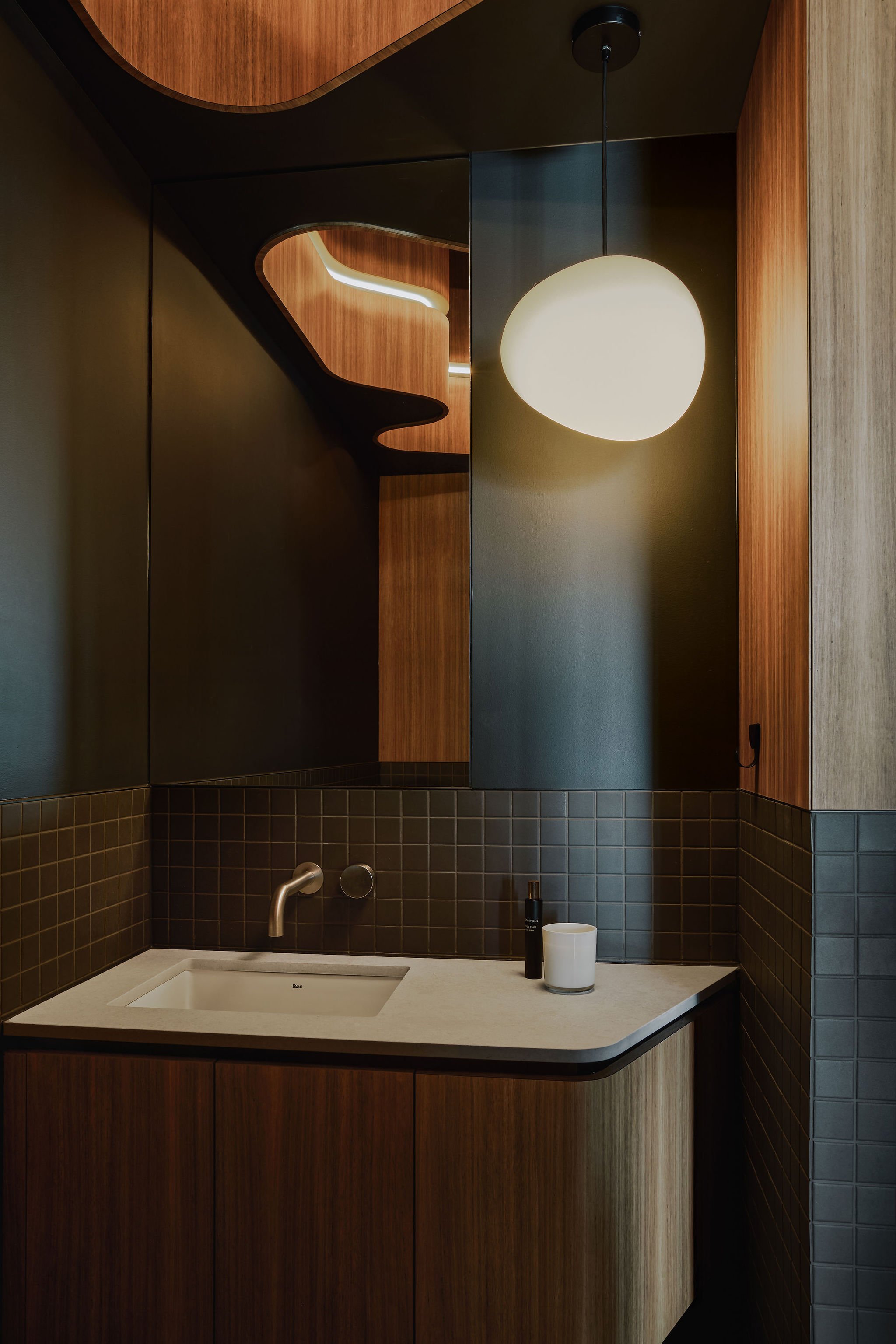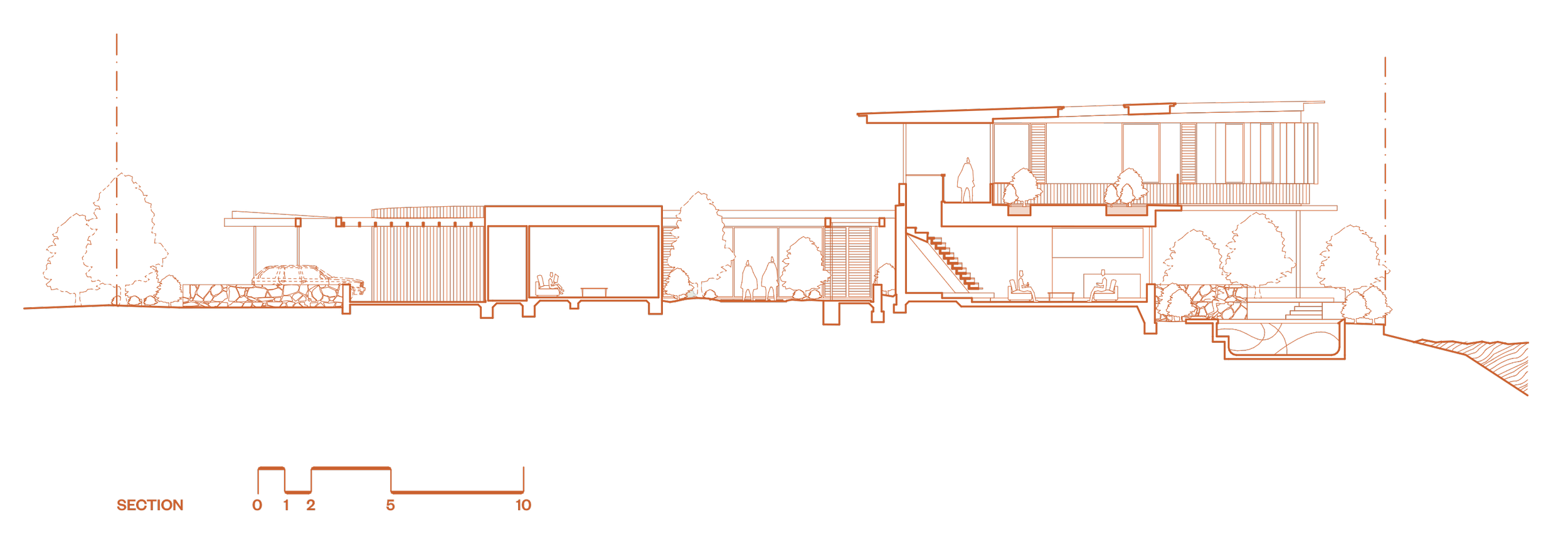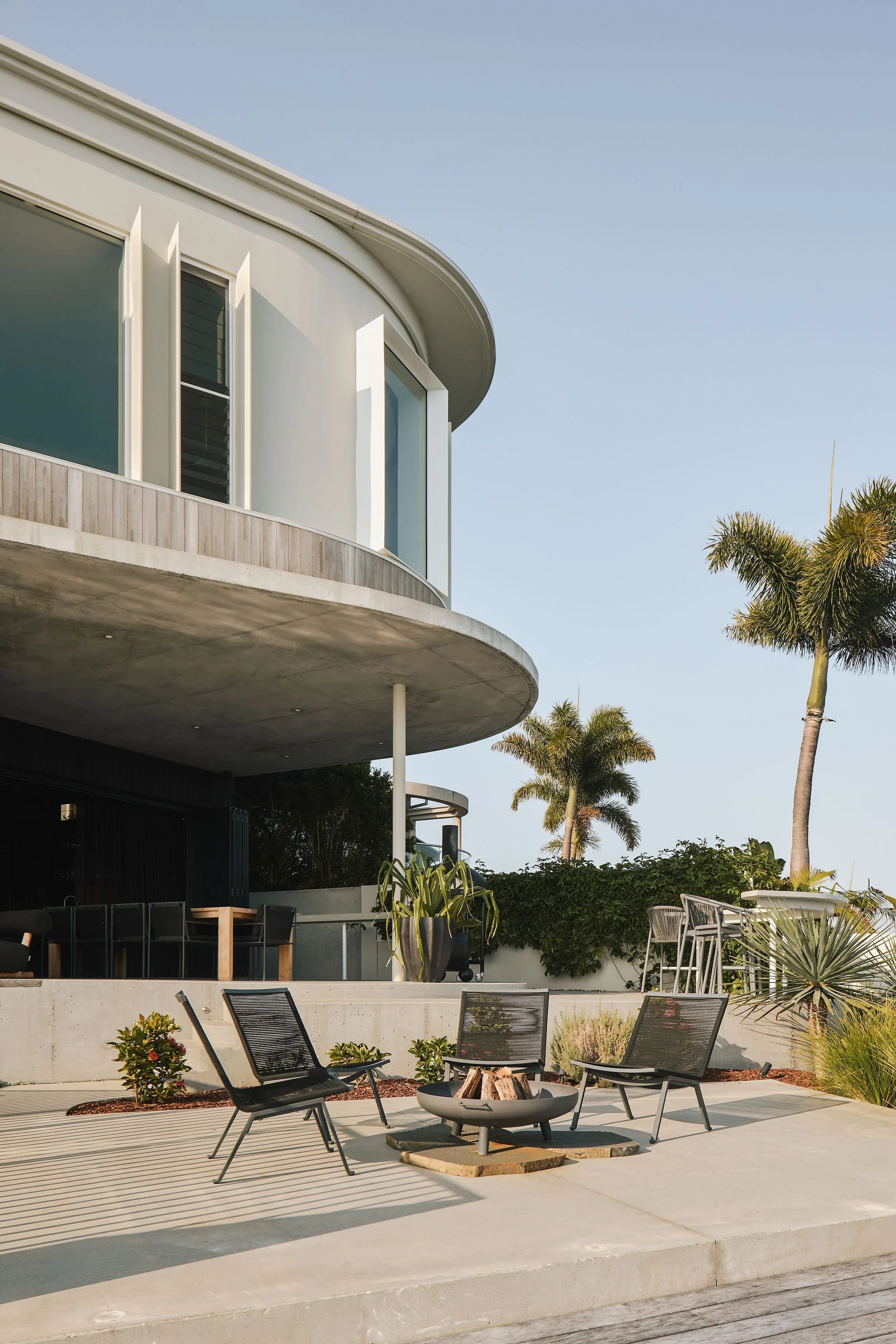 The upper floor is defined by an alternating rhythm of light and shadow created by a series of fine vertical blades. Muted, warm, and earthy materials are displayed against a white backdrop, which acts to frame curated views out to the bay. Each of these frames are large enough to sit in and externally create a nice rhythm as they punch out from the curved form of the building. This level is all about quiet and calm - a place to wind down before bed.