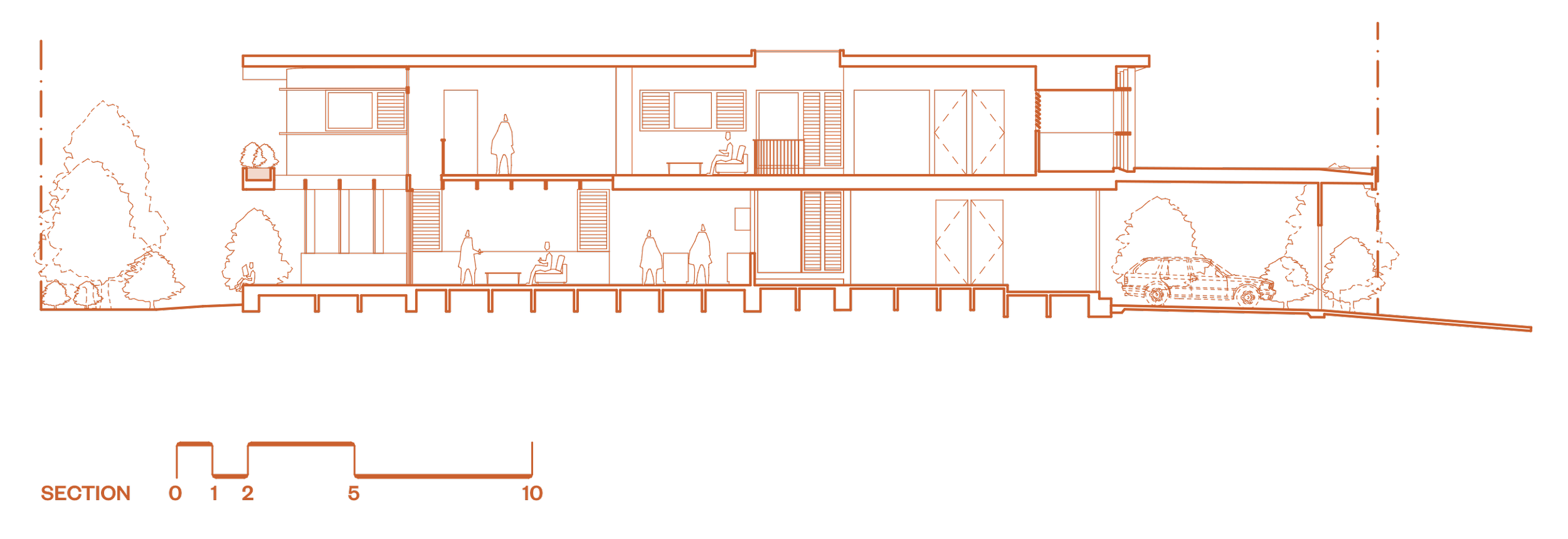 Externally the expressed structure of the house establishes a visual rhythm and sense of order. This structure also creates zones of privacy and engagement and throws deep shadow to bring the house façade to life.
