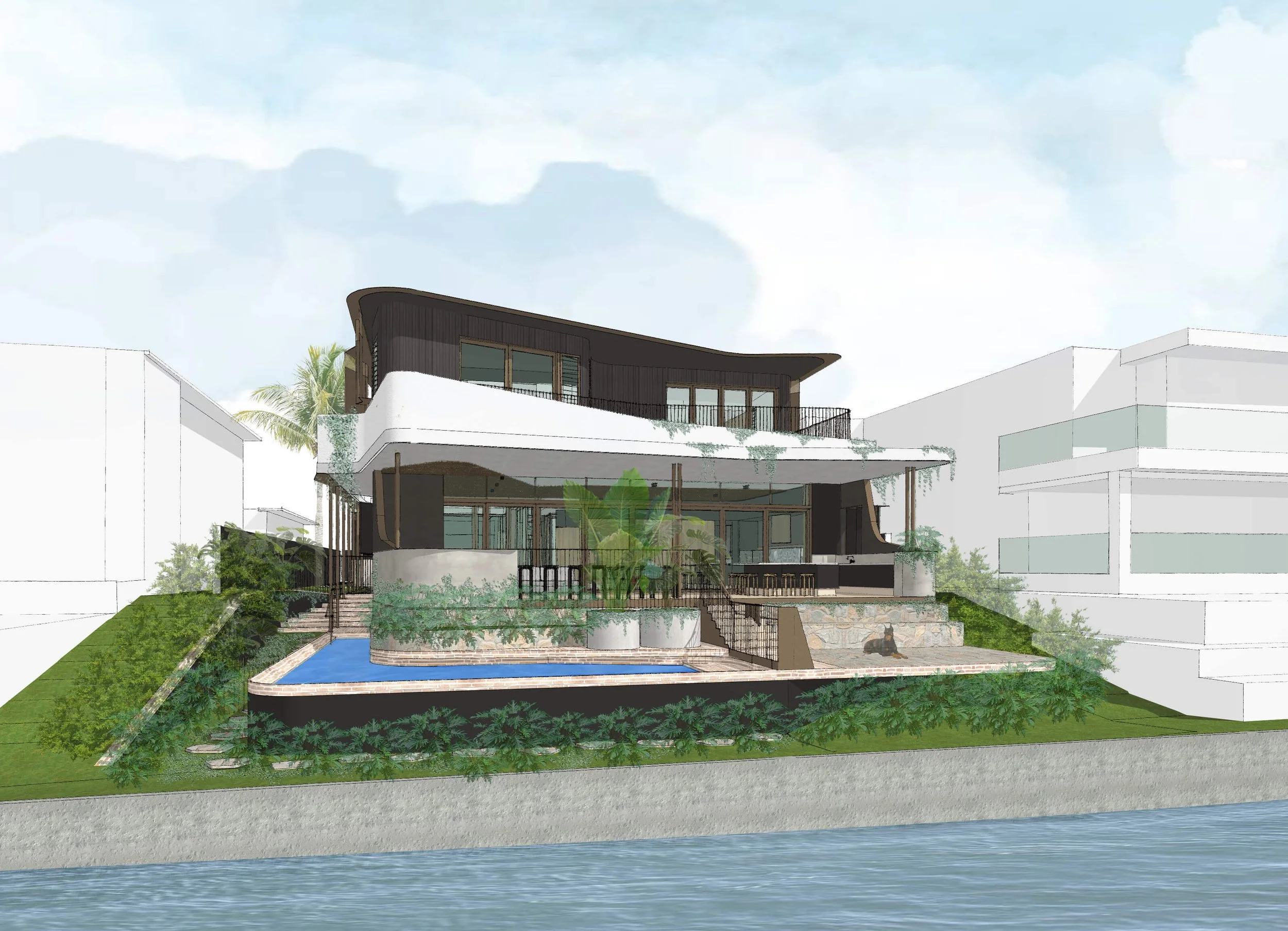 A masonry screen defines this space at a higher level, allowing sun and local bird life to flood the courtyard while maintaining privacy. The house then flows out towards the northern water outlook and views towards the hinterland. Concrete, natural stone and timber provide an elegant and tactile set of materials throughout the house.